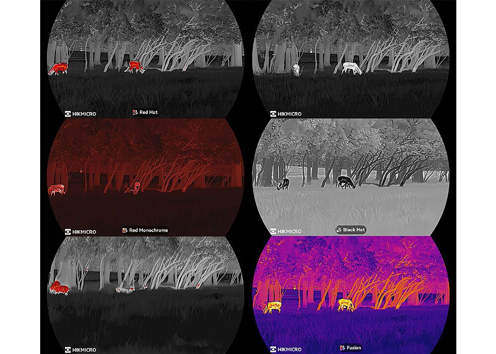 Palettes: Black Hot, White Hot, Red Hot, Fusion, Red Monochrome, Green Monochrome